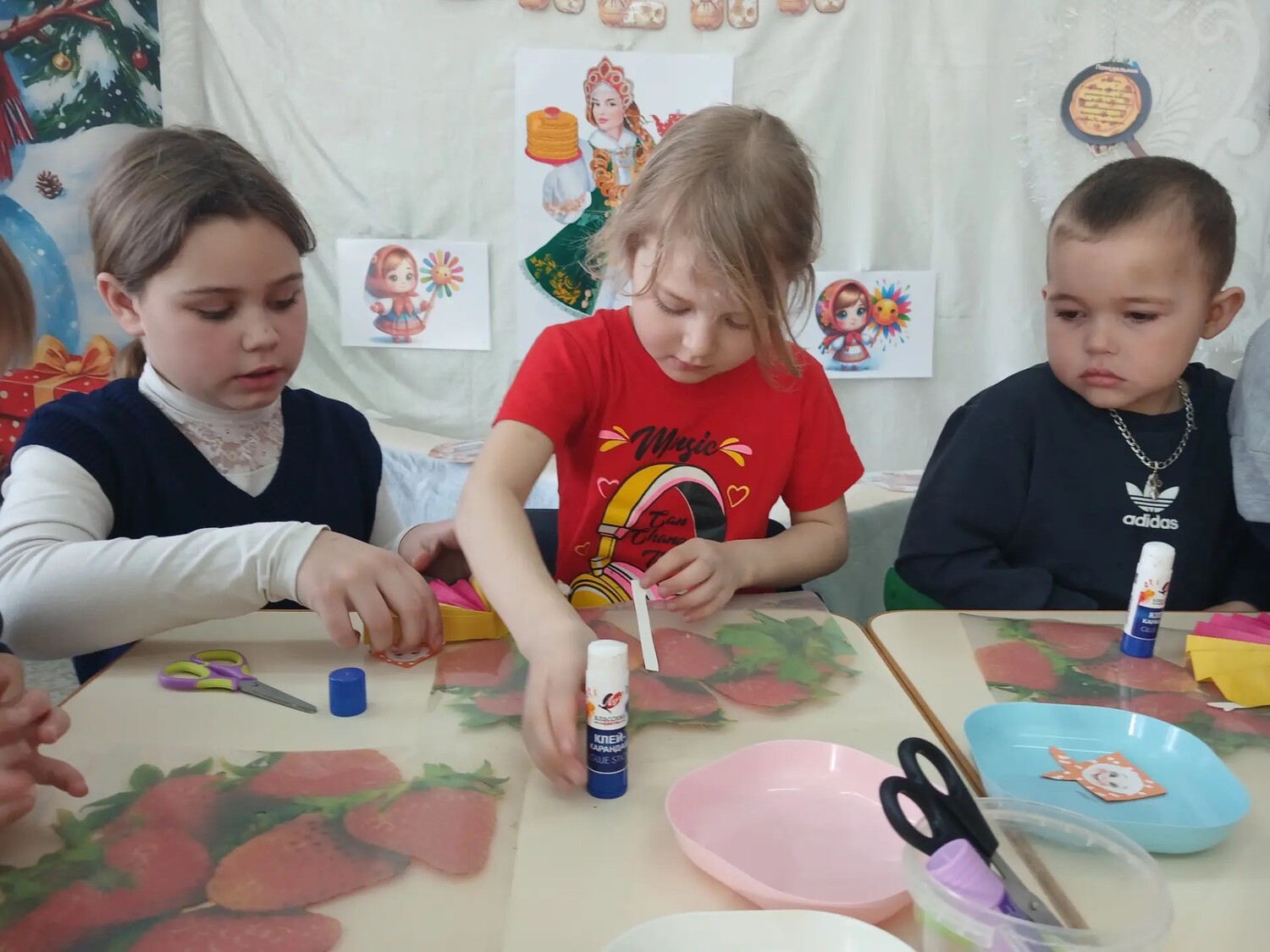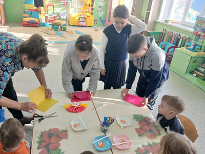 Ученики нашей школы пришли в гости к дошколятам, чтобы поделиться праздничным настроением. Ребята школьники пришли в дошкольную группу провели для малышей увлекательный мастер-класс по изготовлению главного символа праздника — чучела Масленицы.